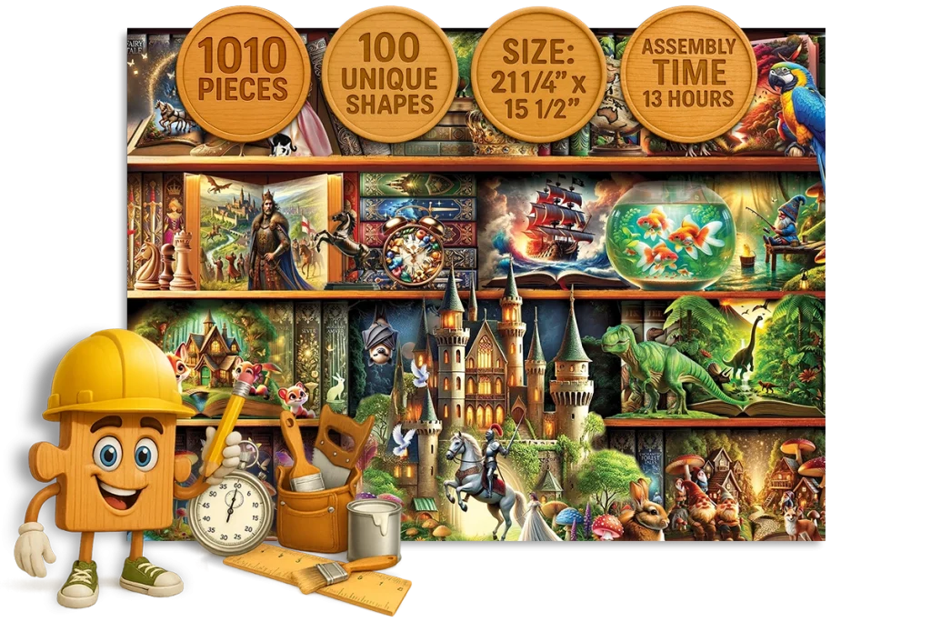 - Stories on Every Shelf 1000 Wooden Puzzle – Treten Sie ein in eine große Bibliothek, in der Bücherportale zu geheimen Welten werden. Ritter, Drachen und Prinzessinnen erwachen zum Leben – ein magisches Abenteuer für gemeinsame Abende.