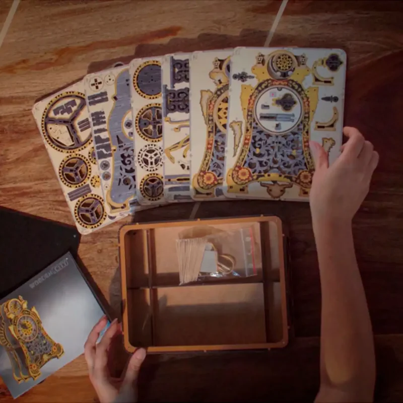 Die Magic Clock wird in einer robusten Holzbox geliefert, die durch Magnete zusammengehalten wird. Diese Box dient nicht nur als Schutzverpackung, sondern verwandelt sich auch in einen Ständer für die zusammengesetzte Uhr und kann als Andenkenschachtel für Ihre Schätze verwendet werden, was die Nützlichkeit und Attraktivität des Produkts erhöht.