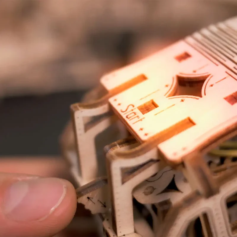 Angetrieben von einem präzisen Gummimotor verspricht der Dream Express jedes Mal eine sanfte Fahrt. Das sorgfältig gestaltete Armaturenbrett steht als Zeugnis für die filigrane Detailgenauigkeit des Modells. Beim Aufziehen erwachen die beweglichen Kolben zum Leben und fangen perfekt die Essenz einer klassischen Lokomotive ein. Der Startschlüssel dient als Herzstück dieses Meisterwerks und setzt den Zug in Bewegung. Ein Starthebel ergänzt die Mechanik und sorgt für ein nahtloses Spielerlebnis. Und für diejenigen, die von längeren Fahrten träumen, ist ein Schienenfragment enthalten, um die Horizonte Ihrer Miniaturwelt zu erweitern.
