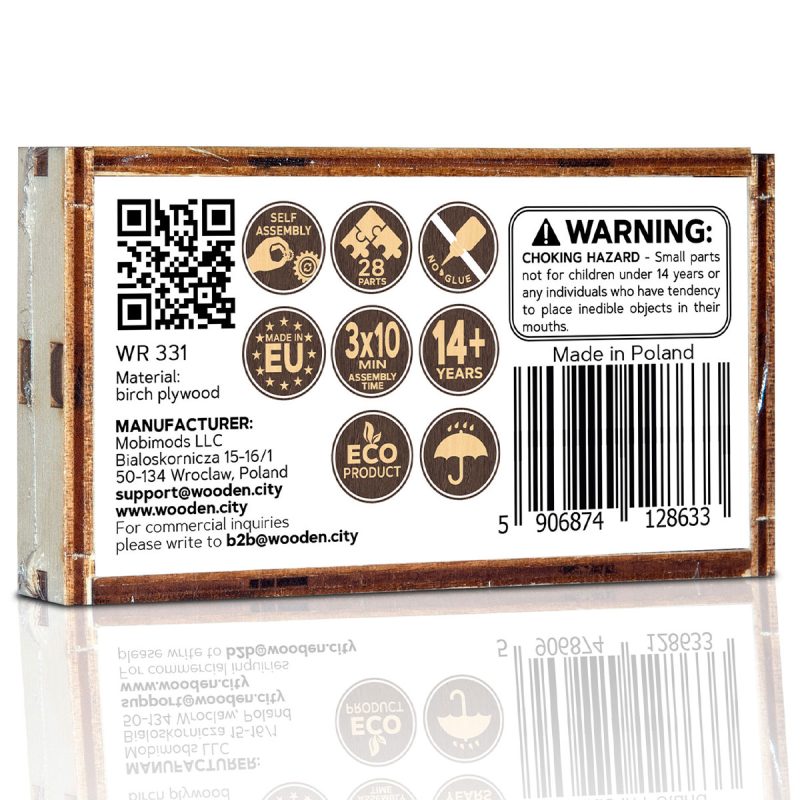| Die Verpackungsbox besteht aus Holz. Innen befindet sich eine Anleitung, wie man nach dem Zusammenbau des Modells auch die Box in einen Präsentationsständer umwandeln kann. | ✔ |