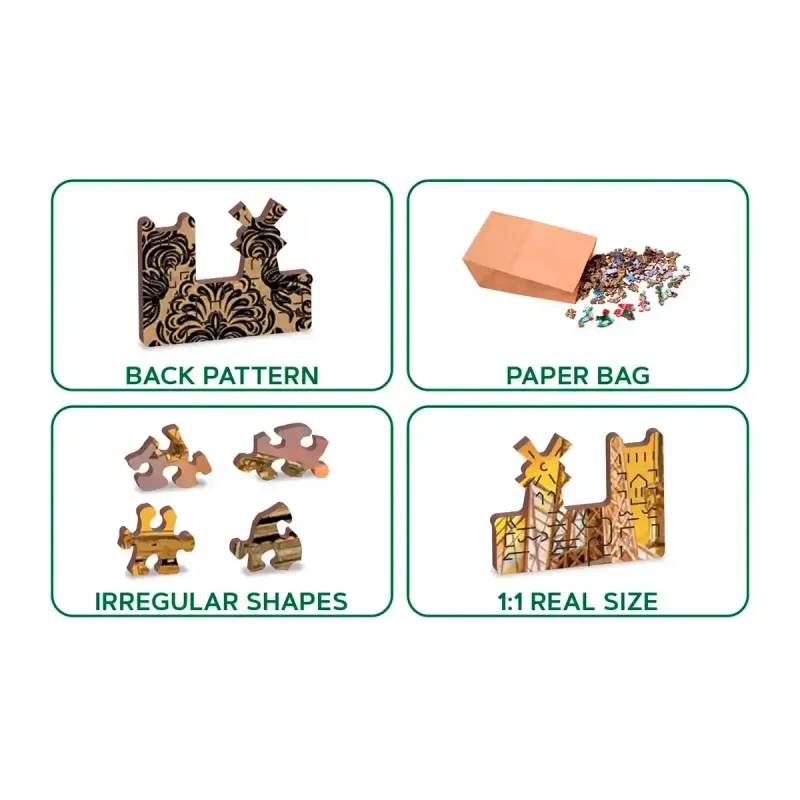 Beginnen Sie dieses Abenteuer mit dem Holzpuzzle und entdecken Sie ikonische französische Symbole – von der majestätischen Eiffel-Turm bis hin zu den verspielten Heißluftballons, die durch den Pariser Himmel tanzen und vieles mehr.