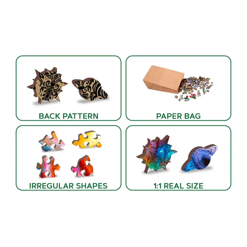 Begleiten Sie uns auf eine intergalaktische Reise, während Sie dieses einzigartige Holzpuzzle zusammensetzen. Von der Weite der Galaxien bis zu den feinen Details von Astronauten und Raumschiffen zieht Sie jedes Teil in eine fantastische kosmische Erzählung hinein. Die lebhaften Farben, die von den tiefsten Blautönen des Weltraums bis hin zu den strahlenden Farben der Planeten und Sterne reichen, sorgen dafür, dass der Zusammenbau ebenso erfreulich ist wie das fertige Meisterwerk.