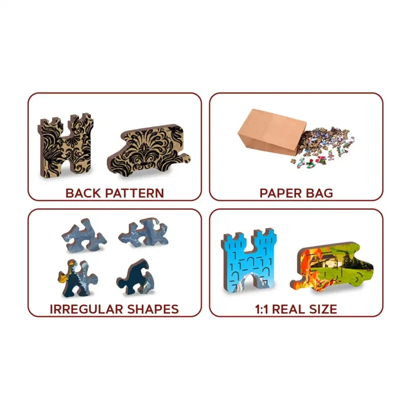 Das Wooden Puzzle lädt Sie ein, die Schönheit und Ruhe der Dolomiten in Italien zu erkunden. Die lebhaften Farben auf jedem Teil rekreieren die Herbststimmung und machen den Zusammenbau zu einem visuellen Genuss.