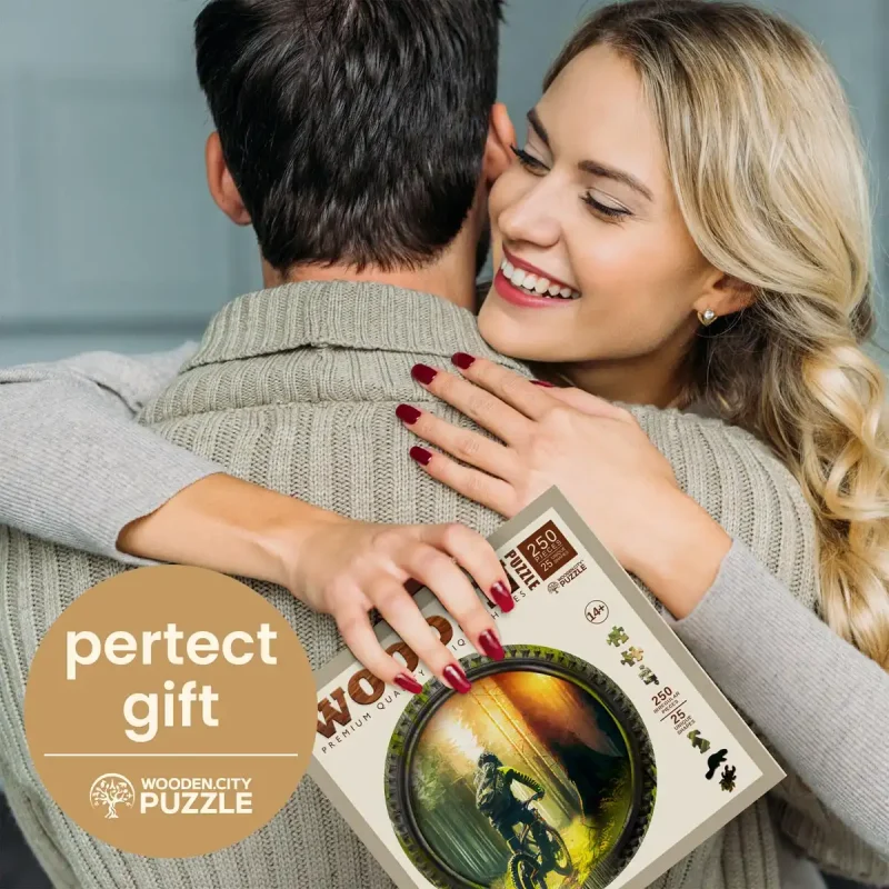 Entdecken Sie die verborgenen Wunder mit dem Fahrrad im Wald 250 Wooden Puzzle. Perfekt für Erwachsene und Kinder ab 10 Jahren bietet dieses 250-teilige, rund geformte Meisterwerk ein facettenreiches Erlebnis.