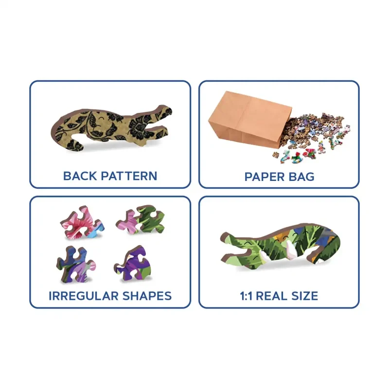 Treten Sie ein in eine kunstvolle Montageerfahrung mit diesem sorgfältig gefertigten Produkt. Jedes Teil verfügt über ein exklusives Design, das sicherstellt, dass keine zwei Teile gleich sind. Mit bedeutenden Elementen in Form von Tieren und Wahrzeichen je nach Thema verspricht Ihre Reise zur Vollendung des Bildes nichts weniger als aufregend zu sein.
