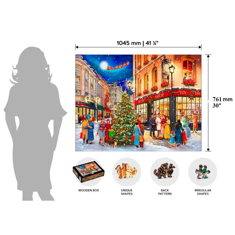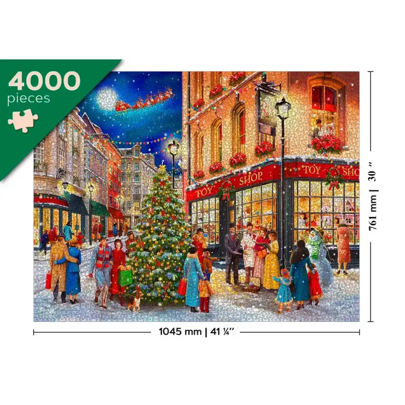 Das „Weihnachtsstraße 4000“ Holzpuzzle erweckt durch 4000 einzigartige Teile, jedes mit seiner eigenen Form und Identität, zum Leben. Es fängt wunderschön eine geschäftige Weihnachtsszene ein, in der Menschen Geschenke kaufen, um den Weihnachtsbaum schlendern und die Dekorationen aus Kränzen und Straßen-Girlanden genießen. Am Himmel sieht man den Weihnachtsmann und seine Rentiere, die eilig Geschenke ausliefern, während ein Schneemann am Baum steht und die festliche Atmosphäre verstärkt.